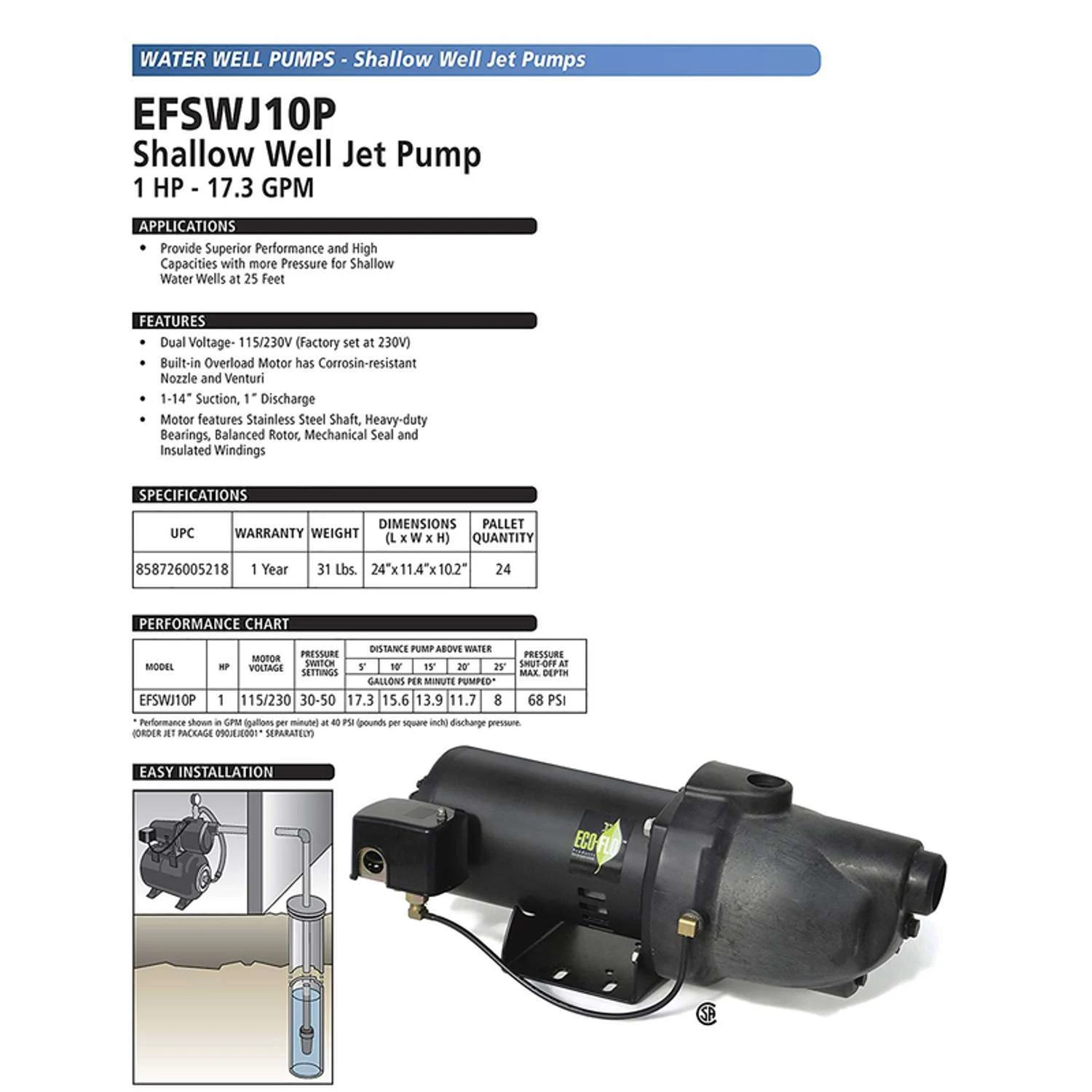 | Search Field | ECO-FLO 1 HP 13.6 gph Cast Iron Shallow Jet Well Pump Pumps and Pump Parts Well Pumps WELL/SPRINKLER PUMPS SHALLOW WELL JET PUMPS ECO-FLO PRODUCTS INC ECO-FLO |