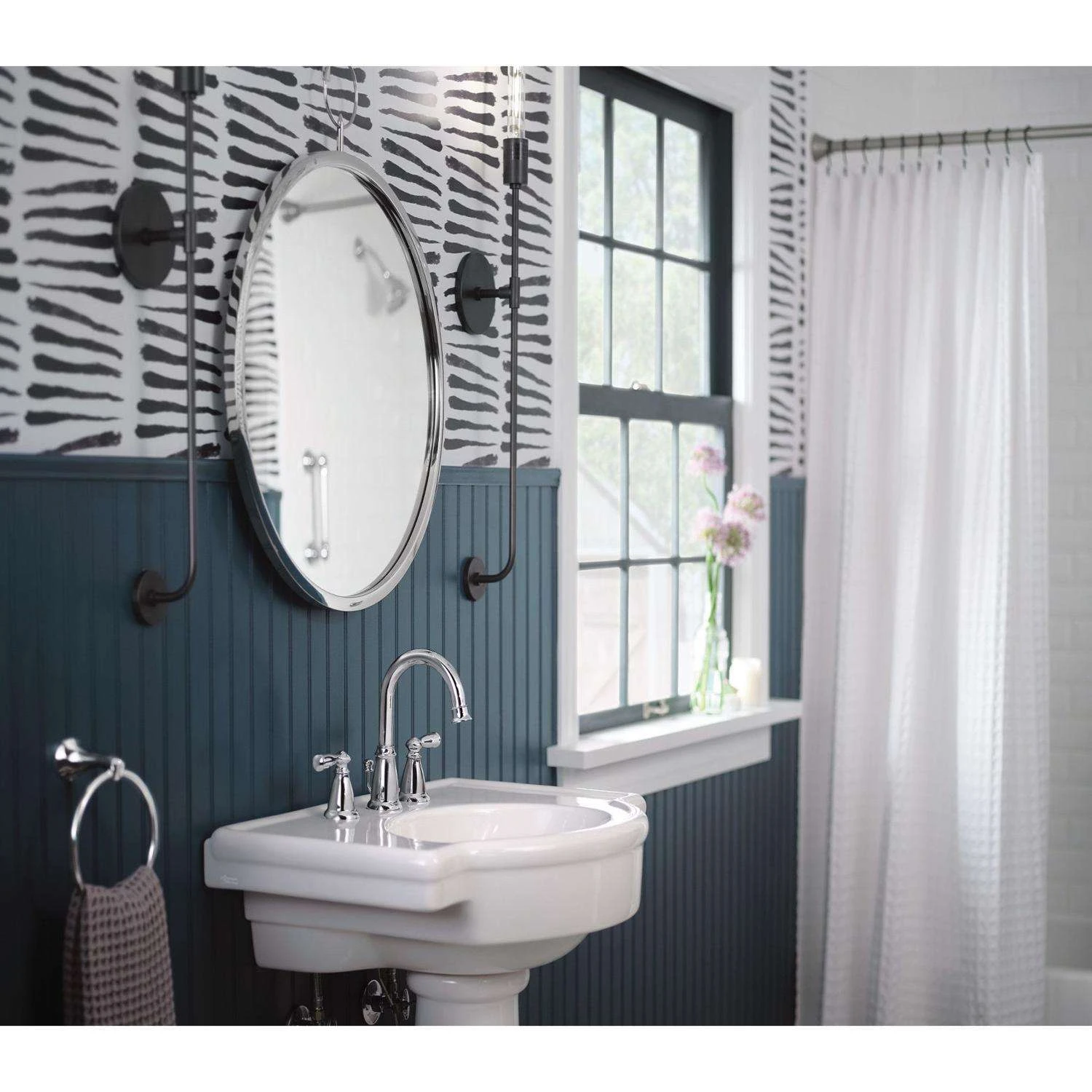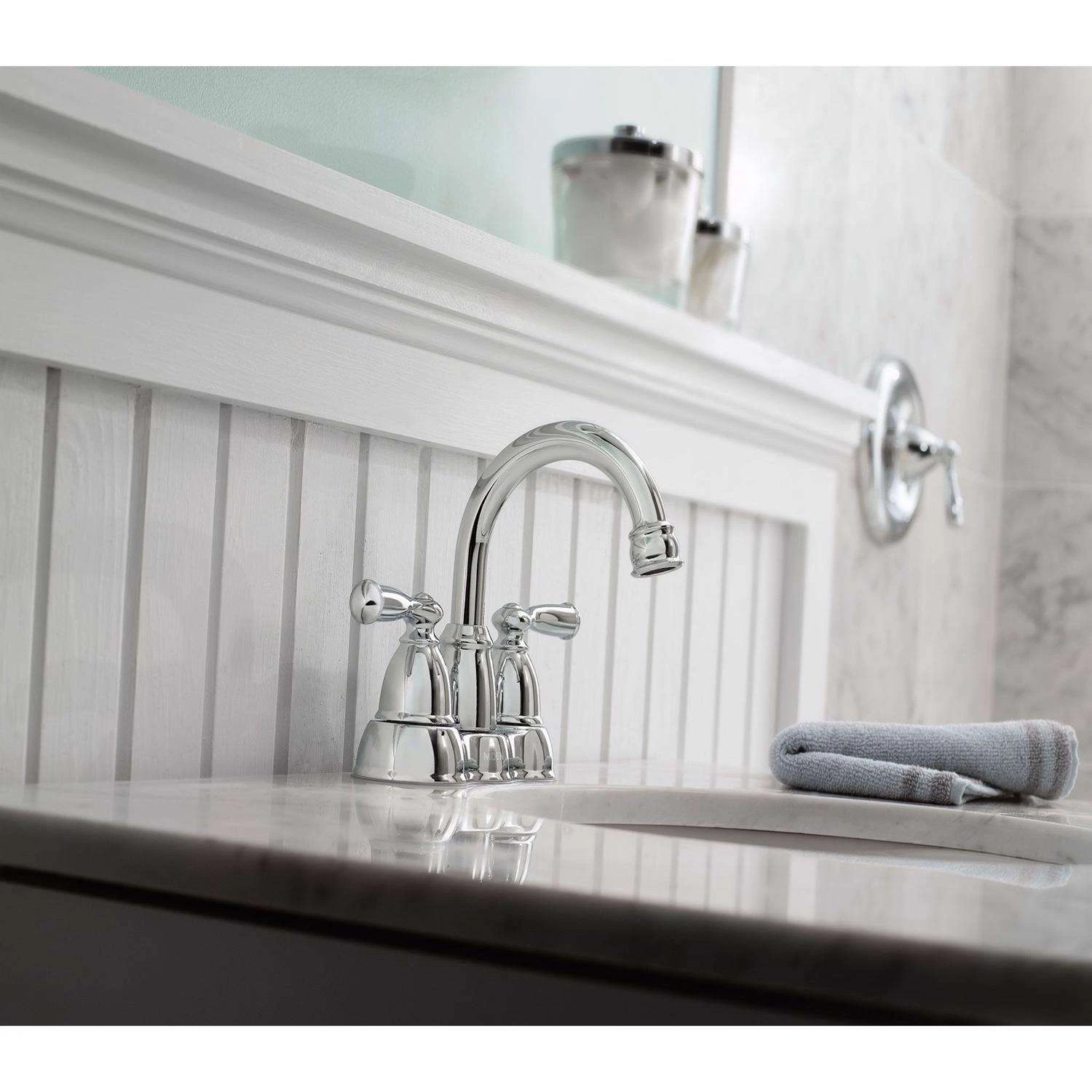 The Banbury collection highlights a timeless nostalgia for traditional versatility and sets a tone that is both classical and sensible. This subtle design is elegant and, with its round bell accents, reflects the sophisticated values of traditional homeowners.Chrome finish is highly reflective for a mirror-like look that works with any decorating style. *Two-handle lever handle makes it easy to adjust the water. *4″ centerset design allows for easy installation. *Complies with Americans with Disabilities Act (ADA) specifications. *Aerated flow is ideal for everyday bathroom tasks, like brushing teeth and washing hands. *Meets EPA WaterSense(r) criteria to conserve water without sacrificing performance. * *Backed by Moen’s Limited Lifetime Warranty