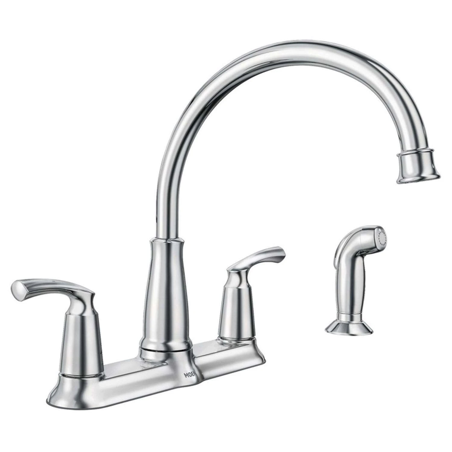 The Bexley collection highlights a timeless nostalgia for traditional versatility and sets a tone that is both classical and sensible. This subtle design is elegant and, with its round bell accents, reflects the sophisticated values of traditional homeowners.Chrome finish is highly reflective for a mirror-like look that works with any decorating style.Features Duralock quick connect system for easy installation.Two-handle lever handle makes it easy to adjust the water.Includes side sprayer for convenient cleaning around your entire sink and powerful rinse for heavy-duty cleaninStandard design mounts on the sink or countertop.Backed by Moen’s Limited Lifetime Warranty.