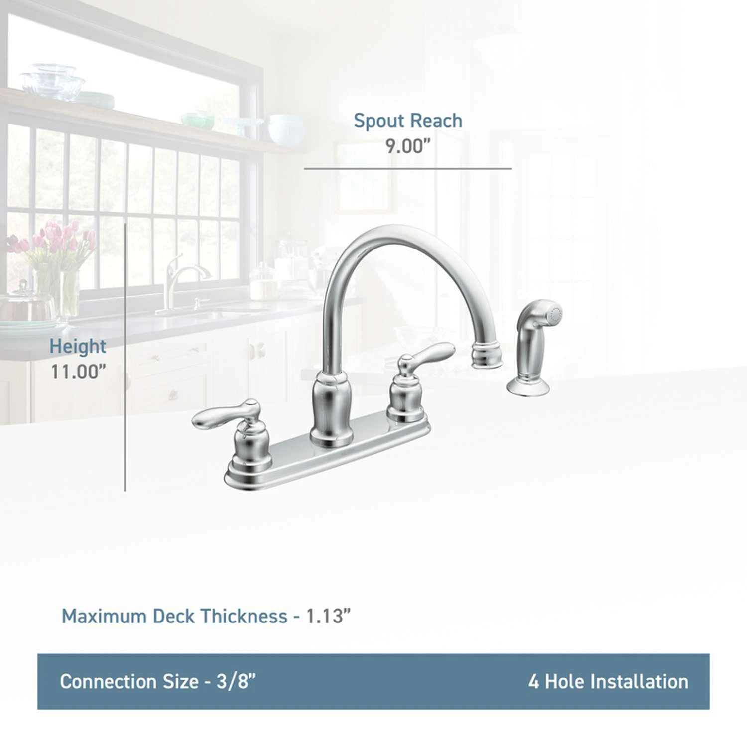 Moen’s Caldwell collection offers homeowners classic styling with soft curves and rich details. Gracious and uncomplicated style features give the Caldwell collection an ageless yet fashion-forward presence. Tailored yet relaxed, the Caldwell collection is an exercise in design balance. This lustrous collection works seamlessly with today’s lifestyles.Chrome finish is highly reflective for a mirror-like look that works with any decorating style.Features Duralock quick connect system for easy installation.Two-handle lever handle makes it easy to adjust the water.Includes side sprayer for convenient cleaning around your entire sink and powerful rinse for heavy-duty cleaningStandard design mounts on the sink or countertop.Complies with Americans with Disabilities Act (ADA) specifications.Meets current legislation, including ab1953 (california) and s152 (vermont).Backed by Moen’s Limited Lifetime Warranty. *
