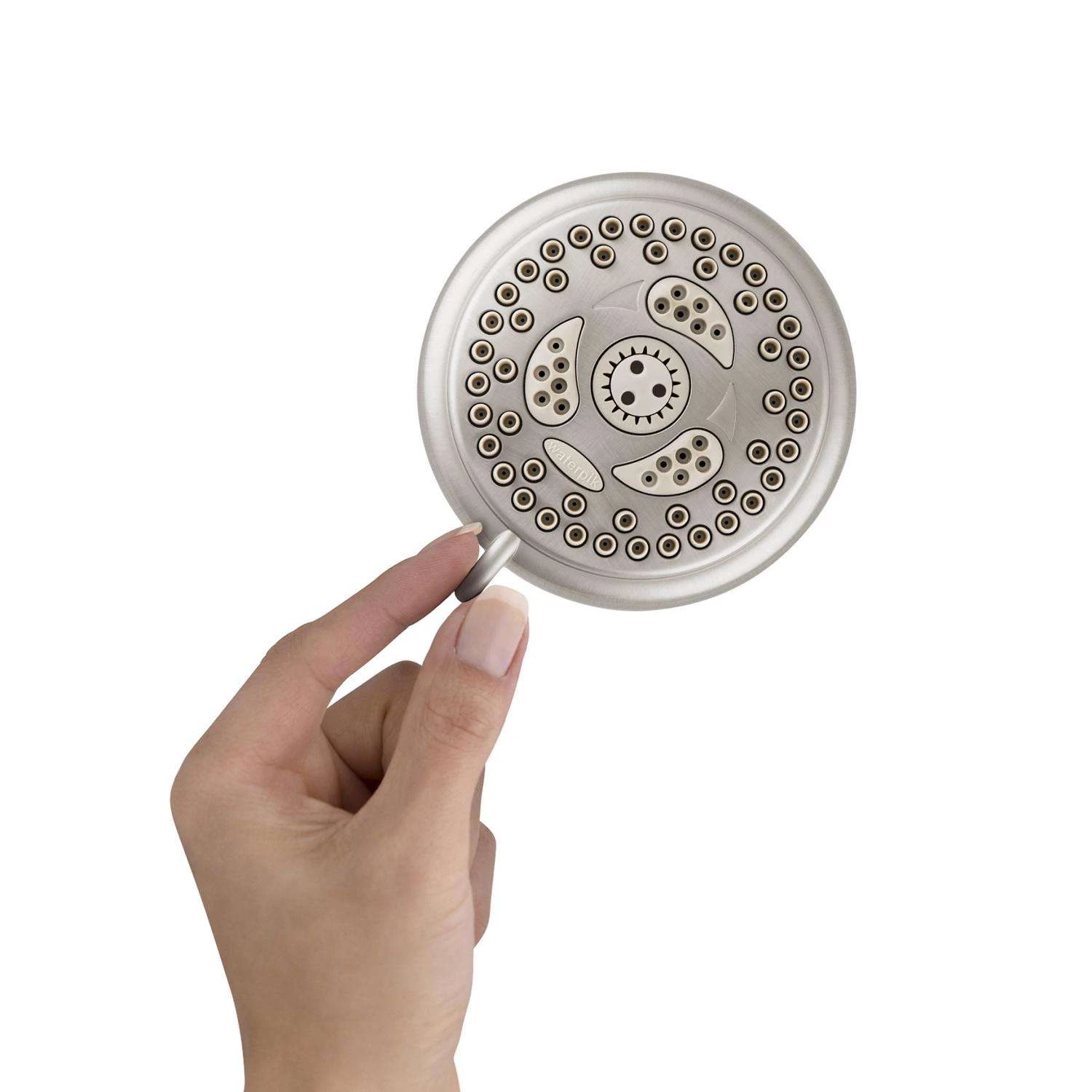 This brushed nickel shower head’s timeless design combines classic styling with tasteful updates to make it fit well in both traditional and contemporary bathrooms.Installs in MinutesShowerhead with 6 Spray FunctionsFull Body, Powerspray, Pulsating Massage, Powerspray & Fall Body, Full Body & Massage and Eco Spray