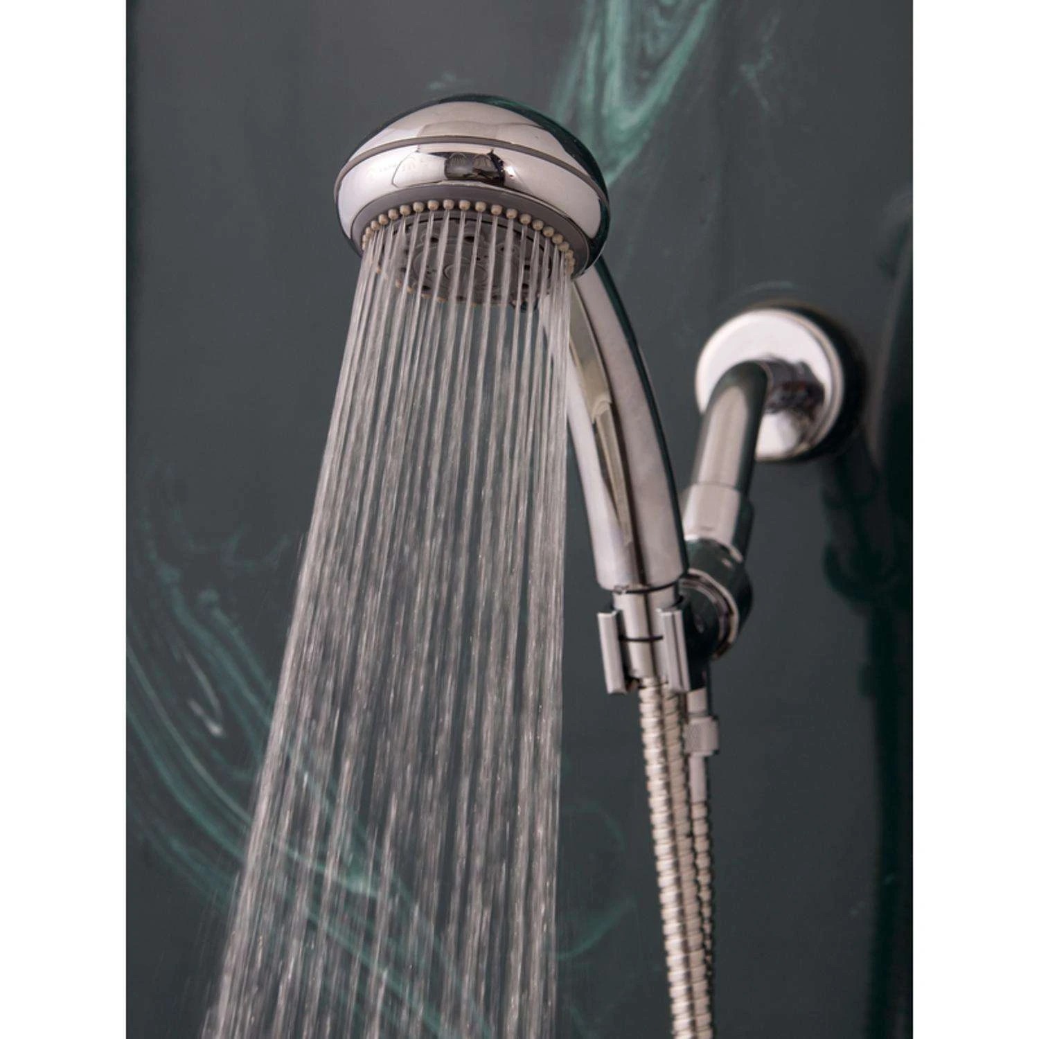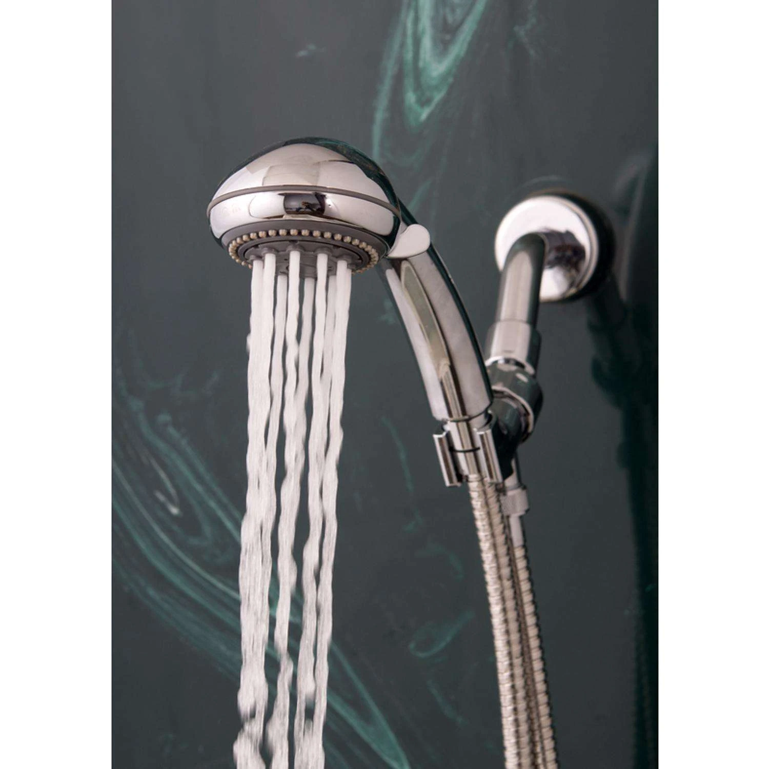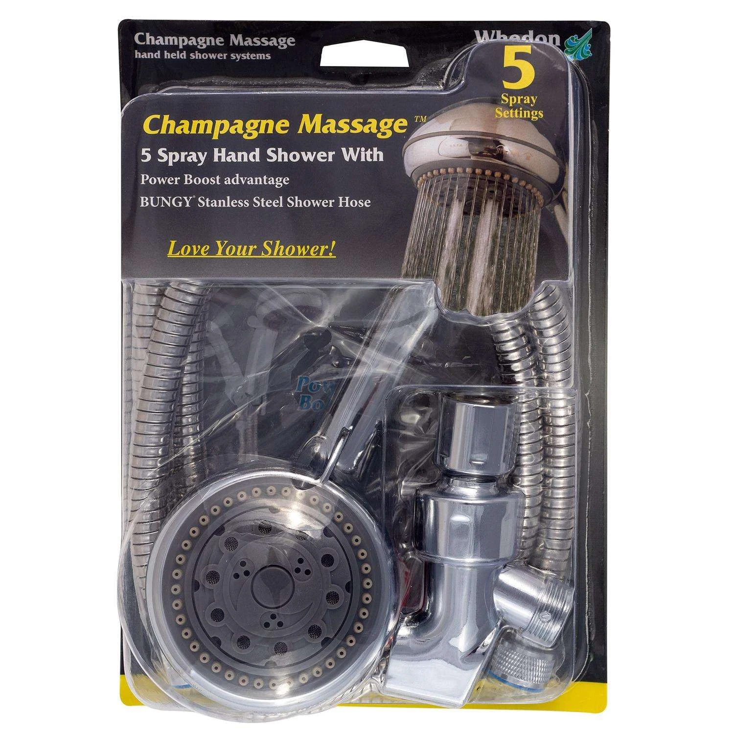 The chrome Champagne Massage 5 spray hand shower system with Bungy (R) shower hose and swivel shower arm mounting bracket for hands free showering. Provides 5 different spray settings including hard shower spray, fast pulsating massage or softer aerated streams plus combination spray and pulse or spray and streams settings. 59″ Bungy (R) stainless steel is extremely flexible, hangs great right out of the package and stretches up to 80″ for greater tub area coverage. 2.5 GPM max at 80 psi, complies with federal codes not legal in CA or CO. Includes Power Boost system for increased performance and higher flow rates in low water pressure areas.Provides 5 different spray settingsIncludes 59″ Bungy shower hose, stretches to over 80″Great for cleaning the tub, washing the dog, for the whole famlyInstalls easily on any standard shower armAllows for hands free showering at the height you choosePower Boost system insures a strong shower in low pressure, allows consumer to adjust flow rate to insure a good strong shower even in low pressure