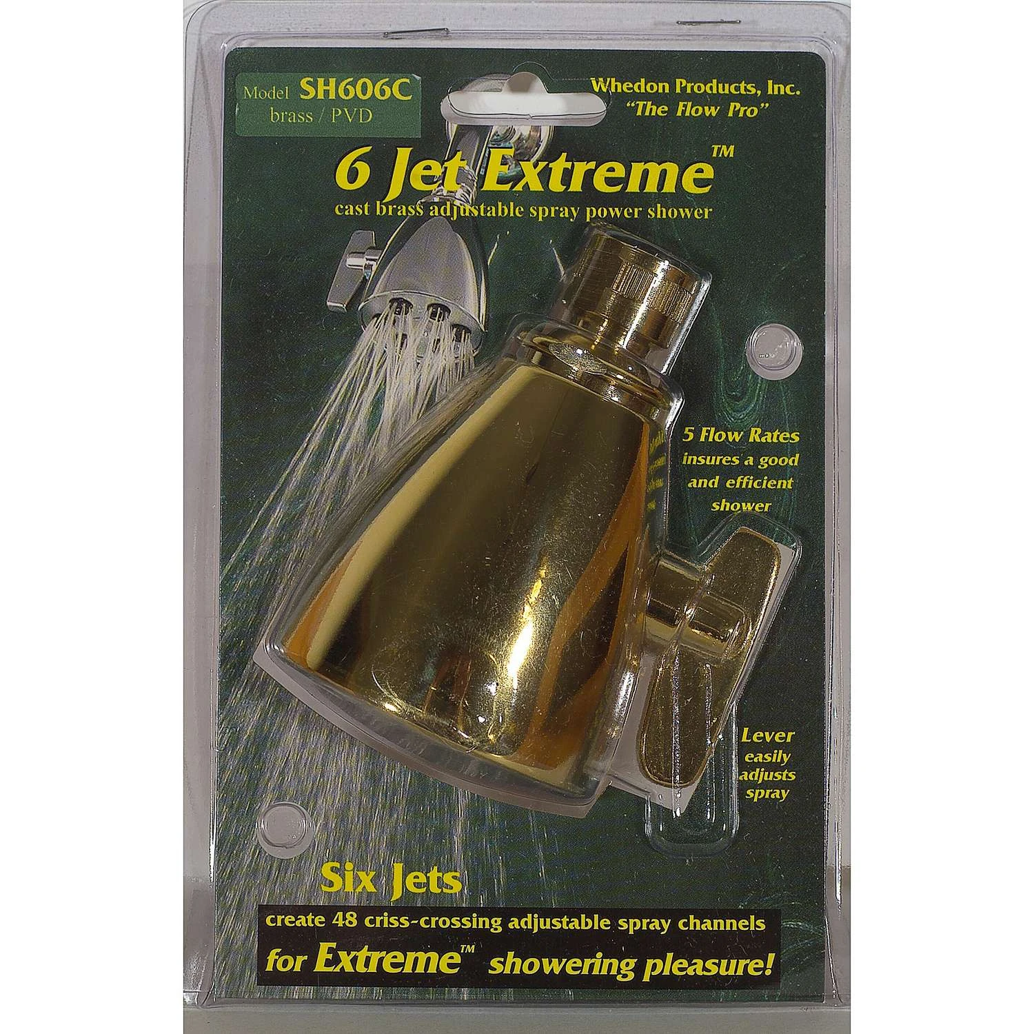 6 Jet Extreme power shower, large cast brass shower head with polished brass finish for look and feel of elegance. 6 fully adjustable spray jets create a criss-crossing full body shower spray. Rated at 2.5 GPM max at 80 psi, complies with federal codes. Power boost system allows for increased performance and flow rate when needed in lower pressure situations. Not legal for sale in CA or CO.6 Jets provide 48 criss-crossing streams for full body sprayLever easily adjust spray from hard wide spray to a softer flowInstalls easily, standard 1/2 inch female threadsSolid brass construction, polished brass finishPower boost advantage for improved performance in low pressure